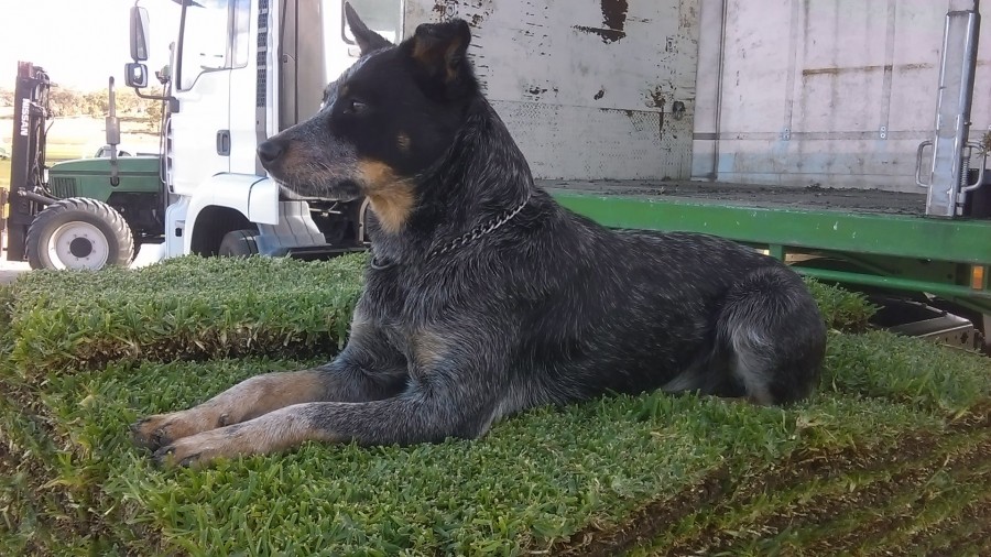 Cracker keeps an eye on the progress of the tractor bringing the next pallet of Sir Walter DNA Certified to be loaded onto the truck at Rivendale Turf.